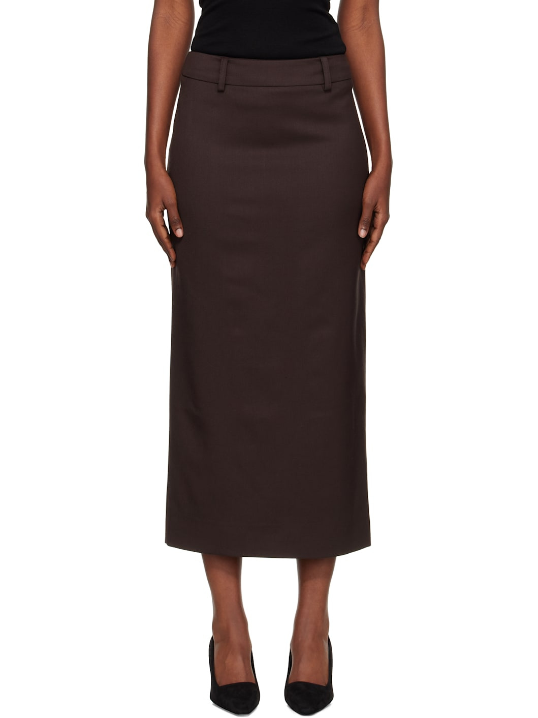 Stretch virgin wool-blend cavalry twill midi skirt. · Slim-fit · High-rise · Belt loops · Concealed zip closure at back · Central slit at back hem · Full satin lining Supplier color: Mocha Body: 54% polyester, 44% virgin wool, 2% elastane. Lining: 100% polyester. Made in France 252115F092003
