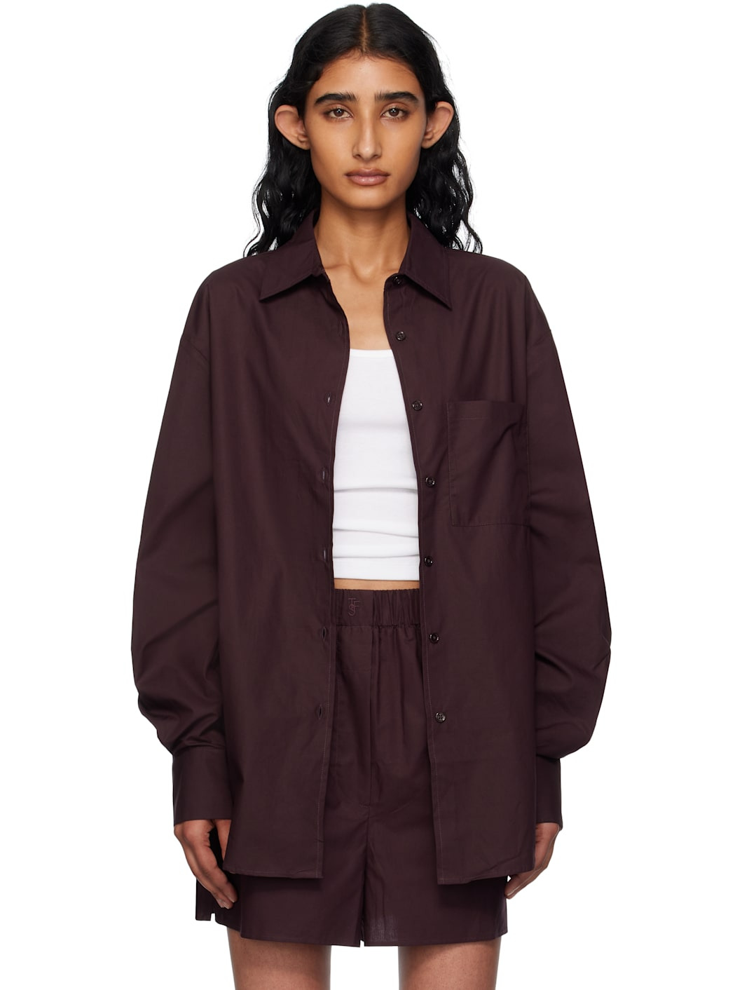 Lightweight organic cotton poplin shirt. · Spread collar · Button closure · Patch pocket at chest · Shirttail hem · Vented side seams · Dropped shoulders · Logo embroidered at cuff · Barrel cuffs · Twin pleats at back yoke Supplier color: Dark plum 100% organic cotton. Made in Morocco 252115F109003