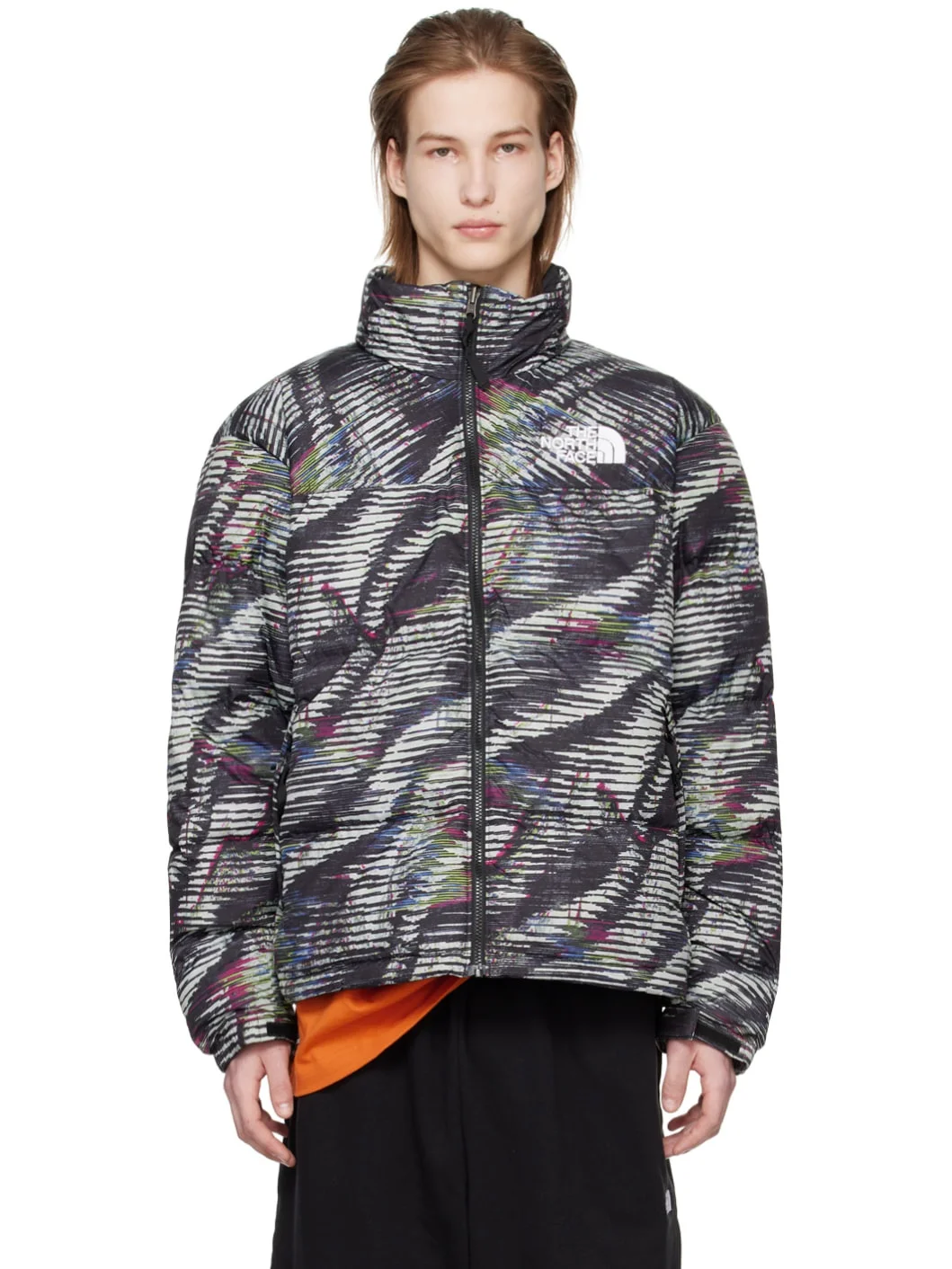 RDS-certified down-filled quilted non-PFC DWR-coated polyester taffeta jacket. Graphic pattern printed throughout. · Water-repellent, windproof, and packable · Stowaway hood at funnel neck · Zip closure · Logo embroidered at chest and back · Zip pockets · Concealed bungee-style drawstring at hem · Text embroidered at cuff · Partially elasticized cuffs · Velcro tab and Triclimate® press-stud tab at cuffs · Zip pocket at interior · Full nylon taffeta lining Supplier color: TNF black/Beta flash print Fill: 85% down, 15% waterfowl feathers.