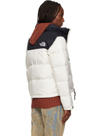 Recycled down-filled nylon ripstop jacket. · Packs into front waist pocket · Water-repellent, non-PFC DWR coating · Funnel neck · Stowaway hood with adjustable cord-lock · Zip closure · Embroidered logo at chest, cuff, and back · Zip pockets at waist · Bungee-style drawstring at hem · Adjustable velcro cuffs · Zip pocket at interior Supplier color: White Dune/Black Body: 100% nylon. Fill: 80% down, 20% feather. Made in Bangladesh 252802F061032
