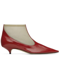 Ankle-high nylon mesh and buffed nappa lambskin boots in beige and red. · Pointed toe · Elasticized collar · Covered kitten heel with rubber injection · Leather sole with rubber injection · Heel: H1.5" Supplier color: Scarlet Upper: textile, lambskin. Sole: leather, rubber. Made in Italy 251359F113004