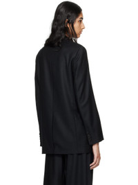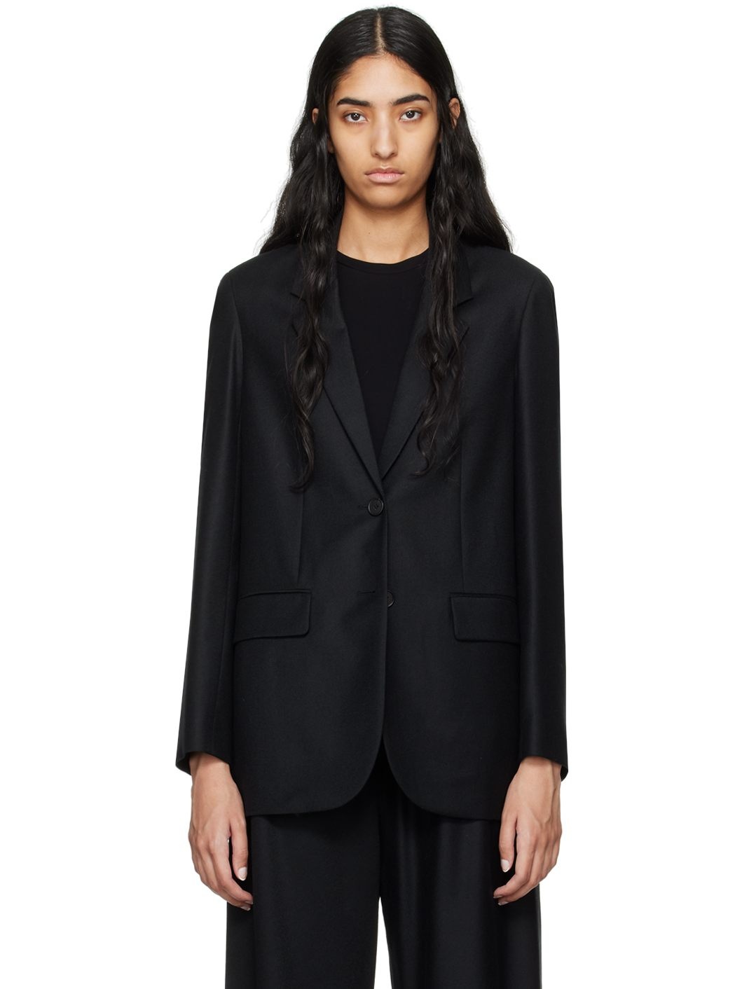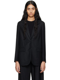 Virgin wool flannel blazer. · Notched lapel · Single-breasted button closure · Darts at front · Flap pockets · Padded shoulders · Four-button surgeon's cuffs · Central vent at back hem · Silk satin lining · Horn hardware Supplier color: Black Body: 100% virgin wool. Lining: 100% silk. Made in United States 242359F057002