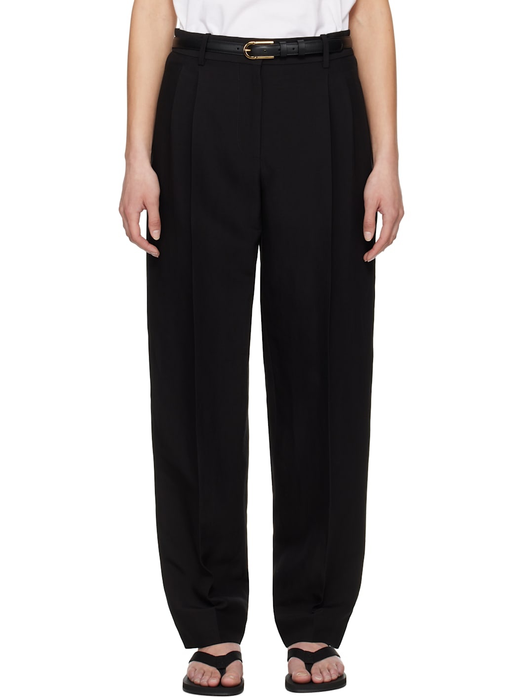 Straight-leg wool- and linen-blend twill trousers. · High-rise · Belt loops · Four-pocket styling · Zip fly · Pleats at front · Creased legs Supplier color: Black 59% wool, 21% linen, 20% nylon. Made in Italy 251359F087019