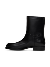 Ankle-high buffed calfskin boots in black. · Pull-loop at heel collar · Buffed leather and suede lining · Logo embossed at padded leather footbed · Topstitching at welt · Stacked leather block heel with rubber injection · Treaded leather sole · Heel: H1.25" Supplier color: Black Upper: calfskin. Sole: leather, rubber. Made in Italy 242359M228001