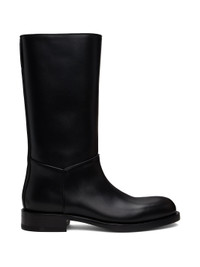 Mid-calf polished calfskin slip-on boots in black. · Scalloped detailing at welt · Buffed leather lining · Stacked leather heel with rubber injection · Polished leather sole · Heel: H1" Supplier color: Black Upper: calfskin, leather. Sole: leather, rubber. Made in Italy 242359F115001