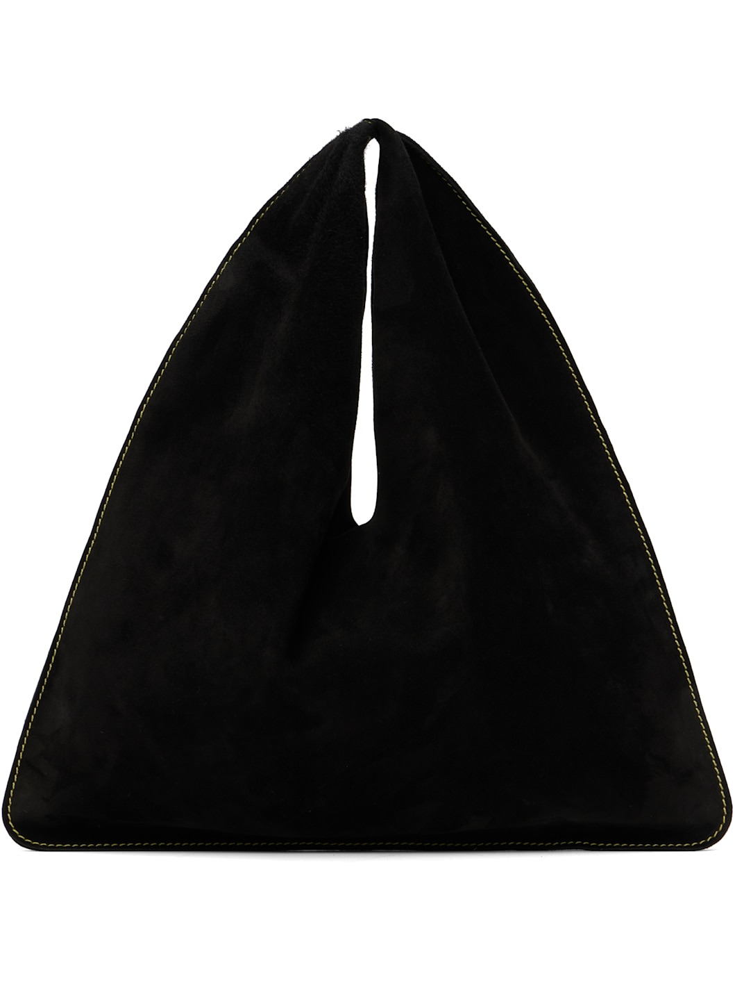Calfskin suede tote. · Integrated carry handle · Grained calfskin interior · Contrast stitching in yellow · H7" x W12" · Total height: H11.5" Supplier color: Black/Lemon Calfskin. Made in Italy 252359F049034