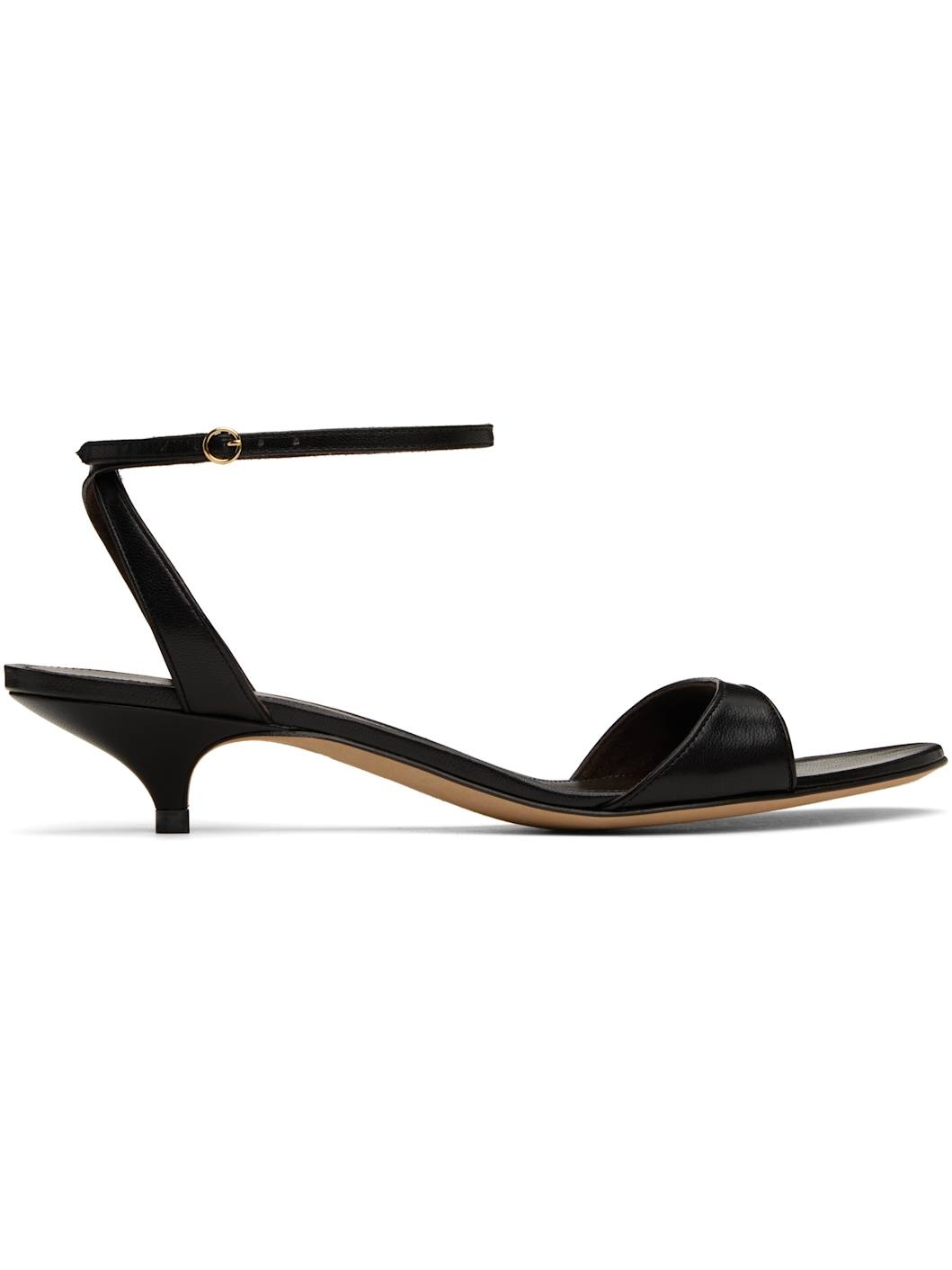 Buffed lambskin heeled sandals in black. · Open toe · Crisscrossing pin-buckle ankle strap · Logo stamp at leather footbed · Covered kitten heel with rubber injection · Nubuck sole · Heel: H1.5" Supplier color: Black Upper: lambskin. Sole: leather. Made in Italy 251359F125010