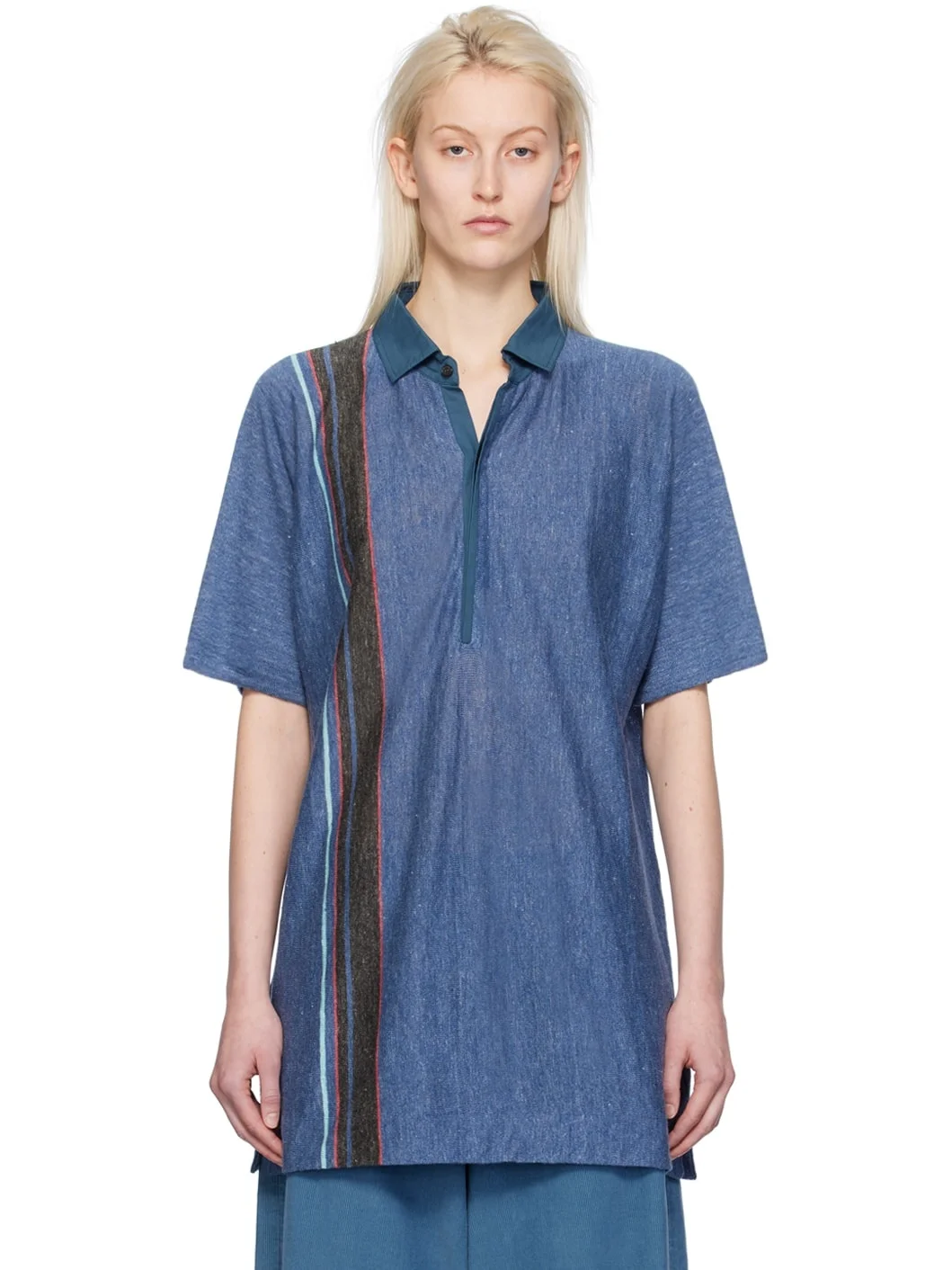 Rib knit linen polo. Stripes throughout. · Cotton poplin spread collar and placket · Concealed three-button placket · Tennis-tail hem Supplier color: Blue shade