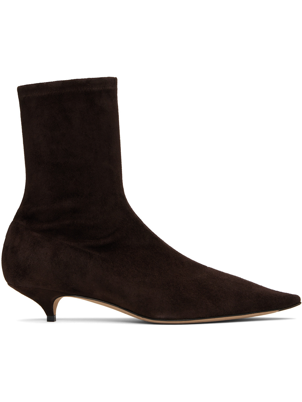 Ankle-high stretch calfskin suede boots. · Pointed toe · Central seam at vamp · Zip closure at inner side · Jersey lining · Covered kitten heel with rubber injection · Nubuck sole with rubber injection · Heel: H1.5" Supplier color: Lacquer brown Upper: calfskin. Sole: leather, rubber. Made in Italy 252359F113006