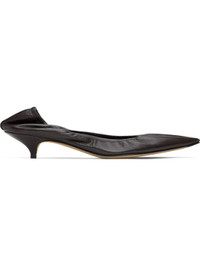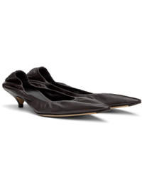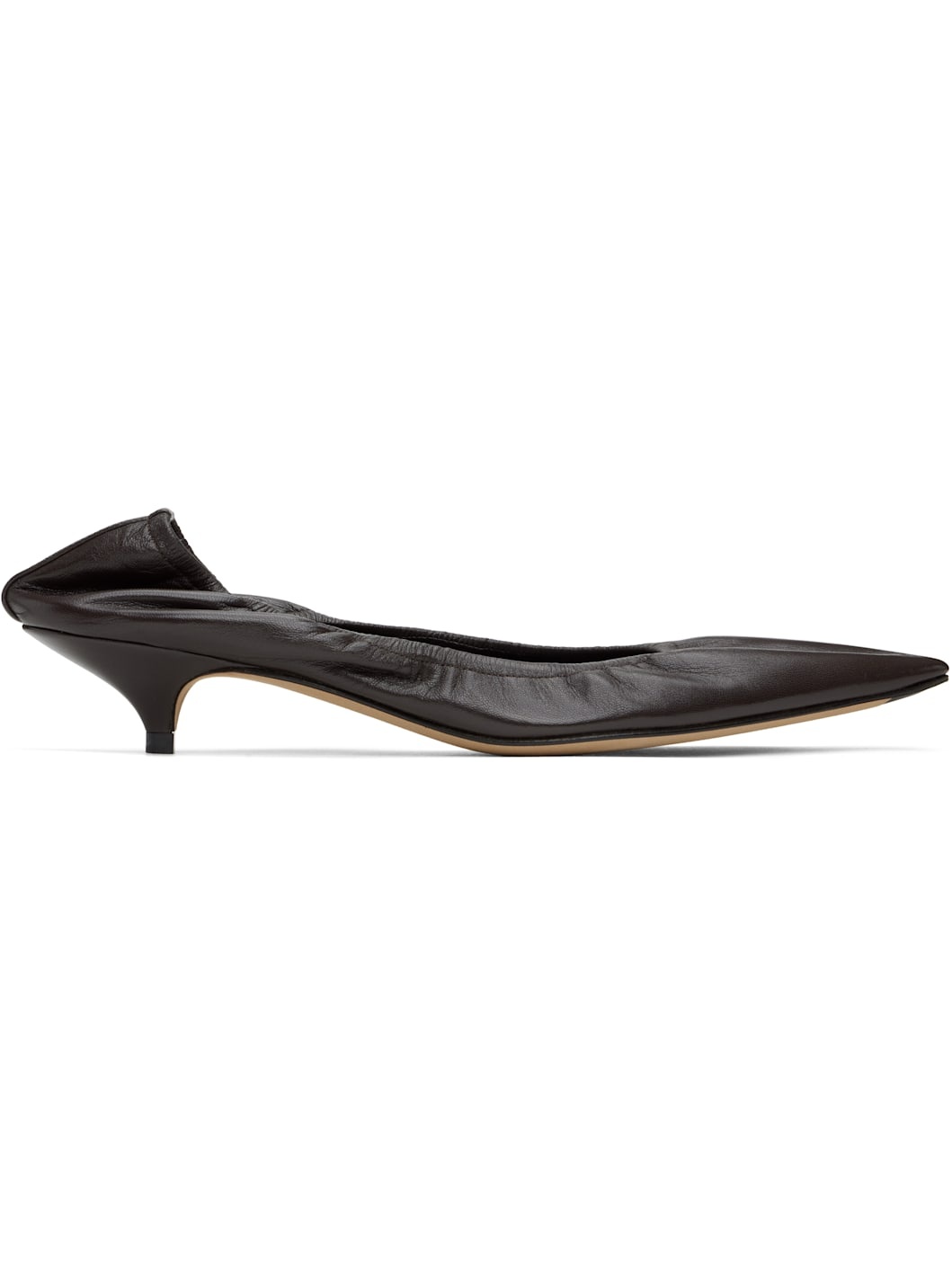 Buffed lambskin heels in brown. · Pointed toe · Elasticized collar · Suede and lambskin lining · Kitten heel with rubber injection · Nubuck sole · Heel: H1.5" Supplier color: Lacquer brown Upper: lambskin. Sole: leather, rubber. Made in Italy 251359F122005
