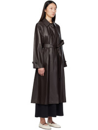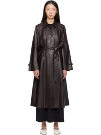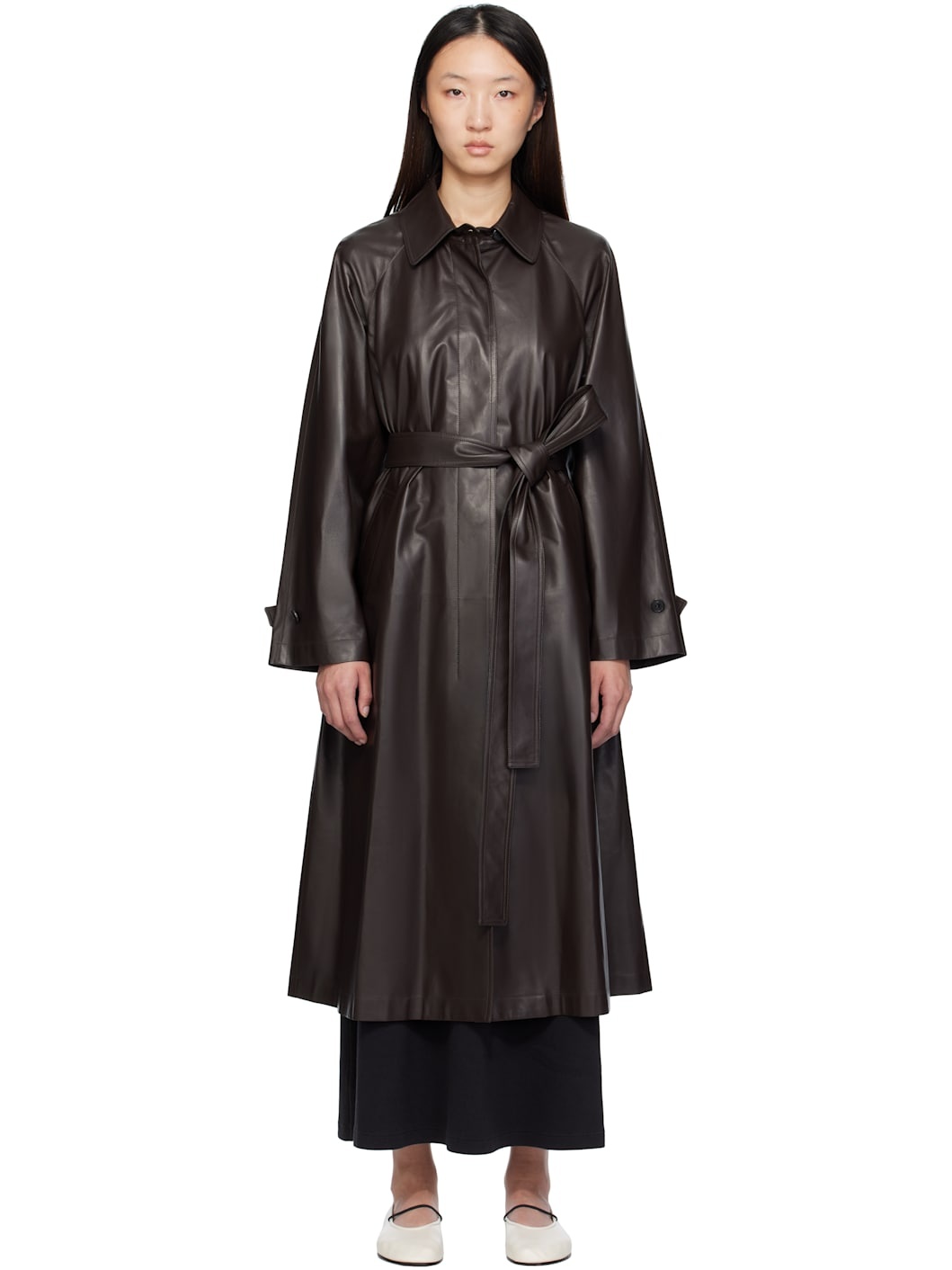 Lightweight grained lambskin coat. · Spread collar · Concealed button closure · Detachable self-tie belt at waist · Welt pockets · Raglan sleeves · Adjustable buttoned tab at cuffs · Unlined · Horn hardware Supplier color: Dark brown Body: 100% lambskin. Trim: 100% buffalo horn. Made in Italy 252359F064001