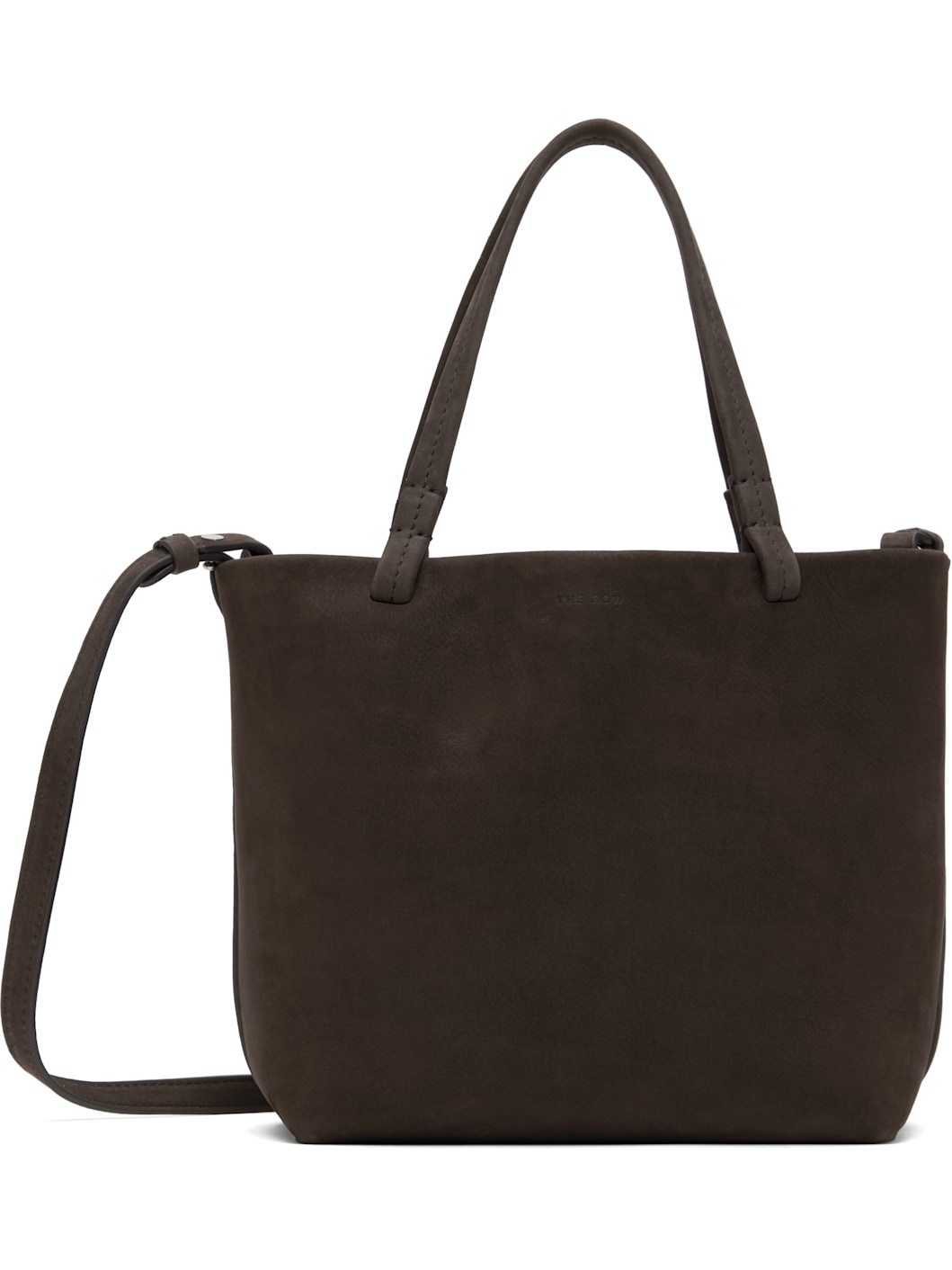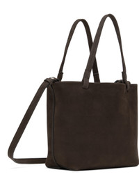 Calfskin suede tote in brown. · Twin carry handles · Detachable crossbody strap · Logo embossed at face · Toggle fastening at open throat · Lambskin suede lining · H6.5" x W10" x D4" Supplier color: Dark mocha Calfskin. Made in Italy 251359F048002