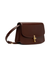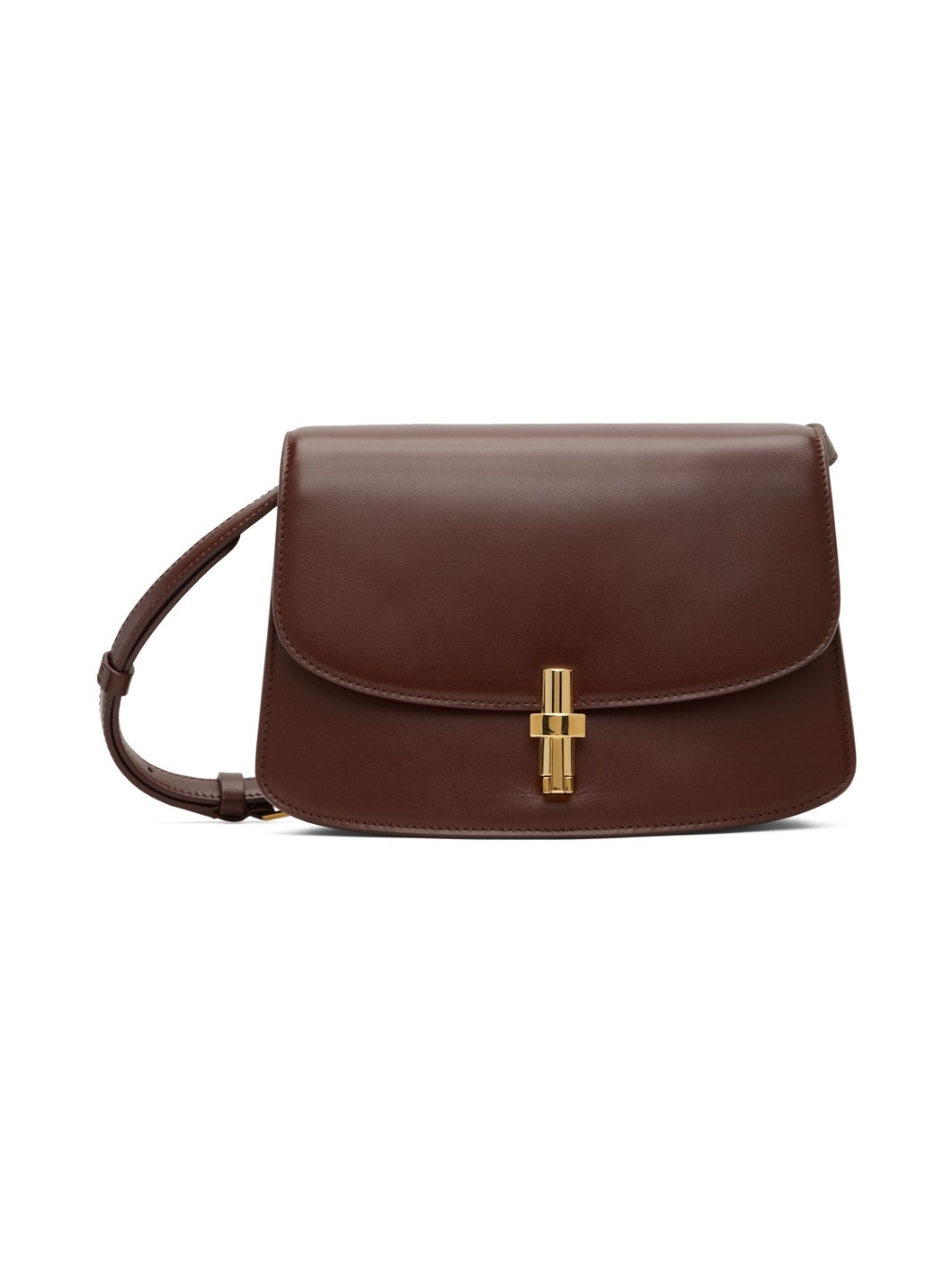 Buffed calfskin shoulder bag in brown. · Adjustable shoulder strap · Logo stamp at face · Foldover flap with flip-clasp closure · Patch pockets at interior · Grained leather lining · H6 x W8.5 x D2.5 in Supplier color: Bourbon