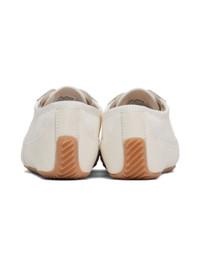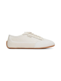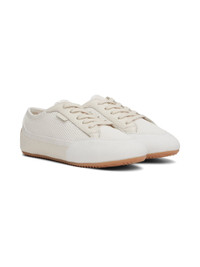 Low-top canvas, mesh, and suede sneakers in off-white. · Buffed leather trim at lace-up closure · Webbing trim at collar and sides · Leather logo flag at outer side · Logo stamp at leather footbed · Canvas lining · Treaded rubber sole Supplier color: Ivory/White Upper: textile, leather. Sole: rubber. Made in Italy 242359F128001