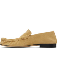 Lightweight calfskin suede loafers. · Gathering and topstitching at moc toe · Strap at vamp · Suede lining · Stacked leather heel with rubber injection · Nubuck sole Supplier color: Yellow linen Upper: calfskin. Sole: rubber. Made in Italy 252359F121006