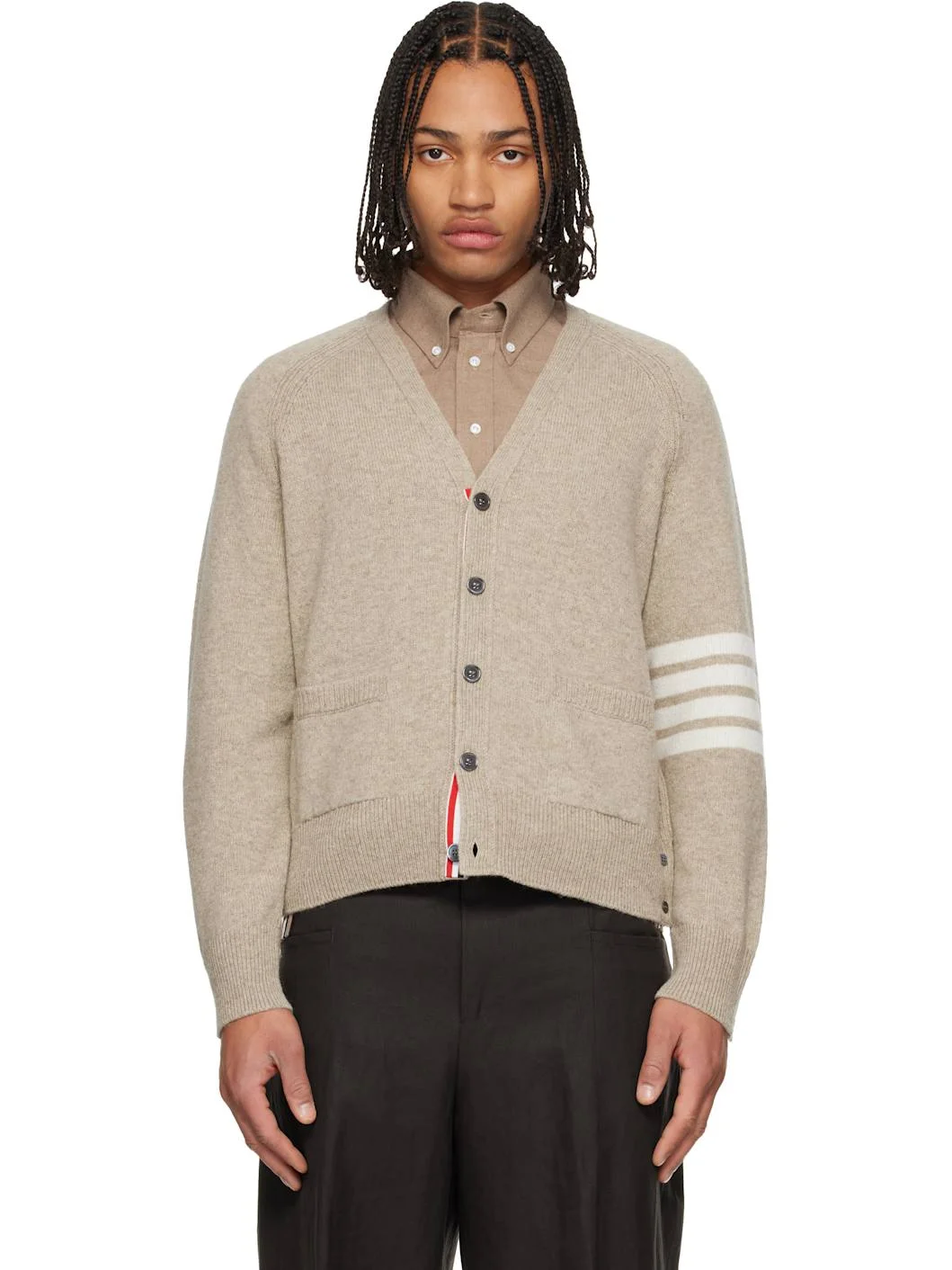 Knit Shetland wool cardigan. · Rib-knit Y-neck, hem, and cuffs · Button closure · Welt pockets at front · Button vent at side seams and cuffs · Raglan sleeves · Stripes at sleeve · Tricolor grosgrain flag at back collar Supplier color: Khaki 100% wool. Made in Italy 252381M200026