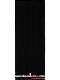 Rectangular cable-knit cashmere scarf. · Logo patch at face · Patch pockets at length · Jacquard stripes at rib-knit ends · Tricolor grosgrain flag at end · L76" x W9.25" Supplier color: Black 100% cashmere. Made in Italy 261381M150000