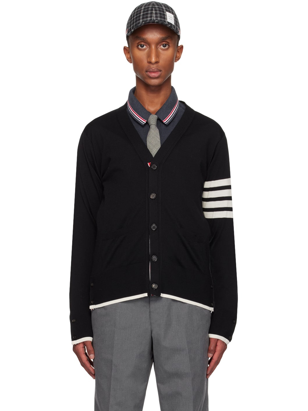 Knit virgin wool cardigan. · Rib knit Y-neck, hem, and cuffs · Button closure · Tricolor grosgrain trim at placket · Patch pockets · Button vent at side seams · Intarsia stripes at sleeve · Two-button barrel cuffs · Tricolor logo flag at back collar Supplier color: Black 100% virgin wool. Made in Italy 242381M200023