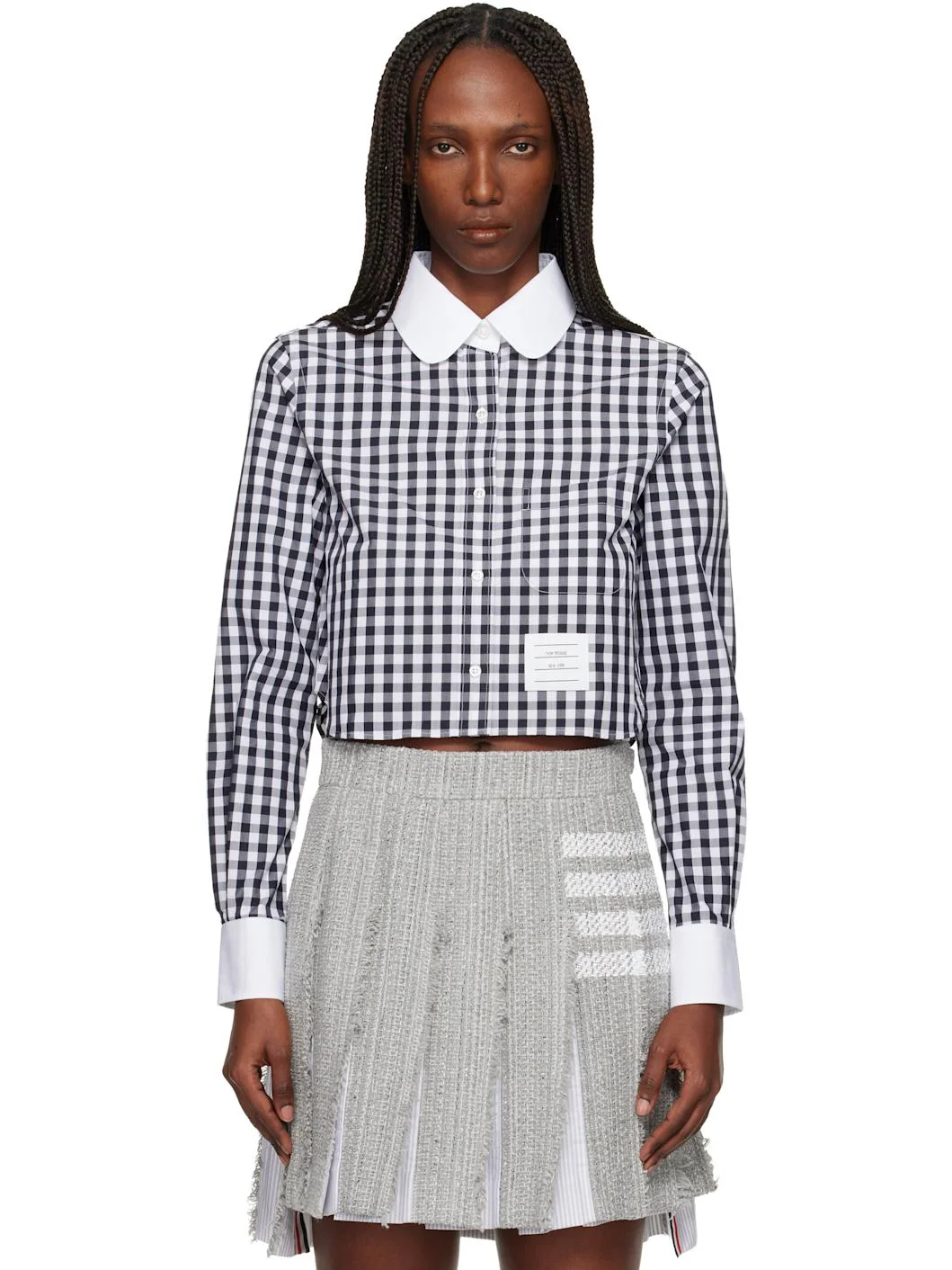 Cotton poplin shirt. · Check pattern throughout · Peter Pan collar · Button closure · Patch pocket at chest · Logo patch at front · Cropped shirttail hem · Buttoned barrel cuffs · Tricolor grosgrain flag at back collar · Locker loop at back yoke Supplier color: Black/White 100% cotton. Made in Italy 252381F109008