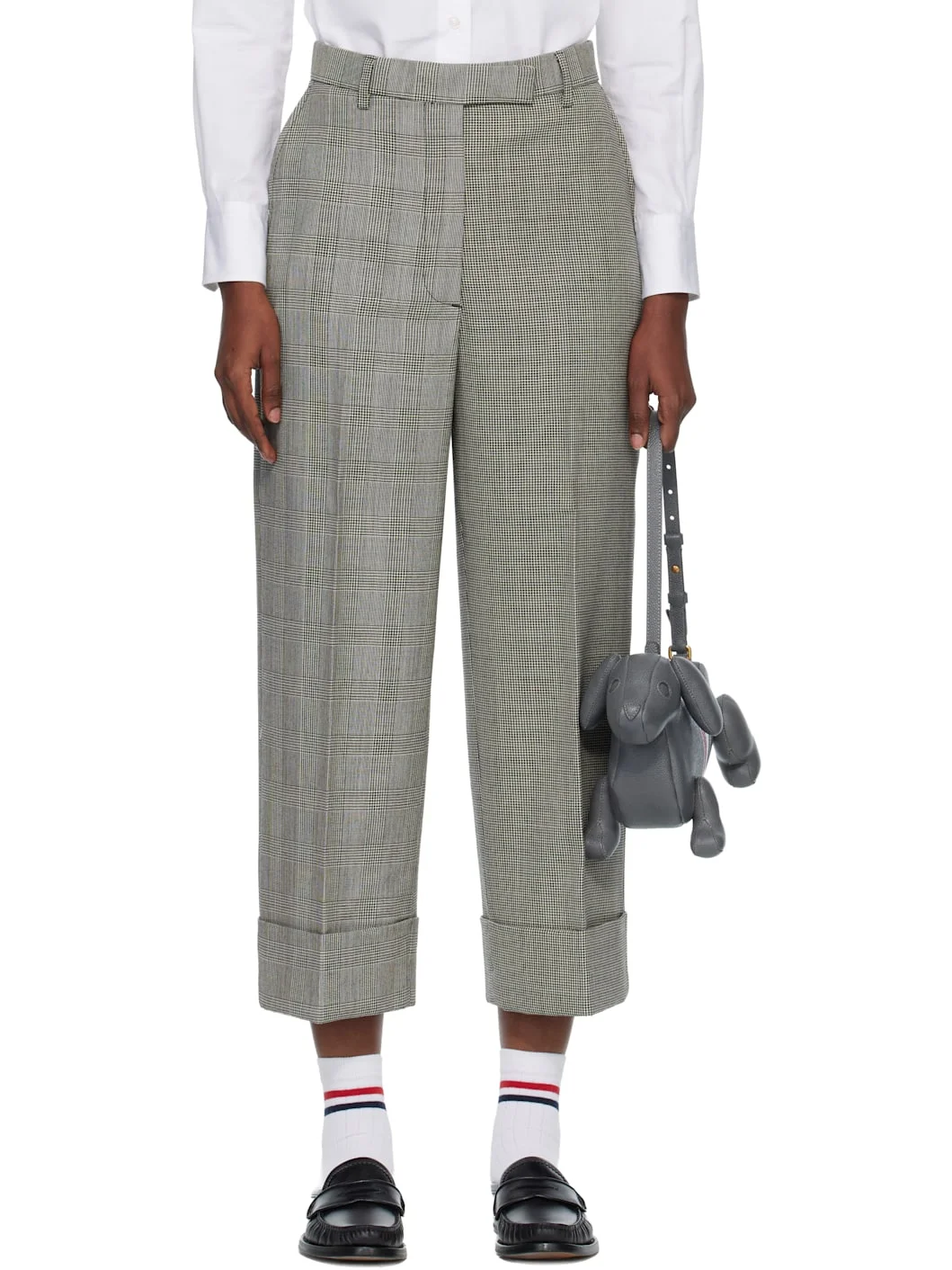 Wool twill trousers. · Houndstooth and check patterns throughout · Belt loops · Four-pocket styling · Zip fly · Creased legs · Rolled cuffs · Tricolor grosgrain flag at back · Fully lined Supplier color: Black/White Body: 100% wool. Lining: 100% cupro. Pocket lining: 65% polyester, 35% cotton. Made in Italy 261381F087001