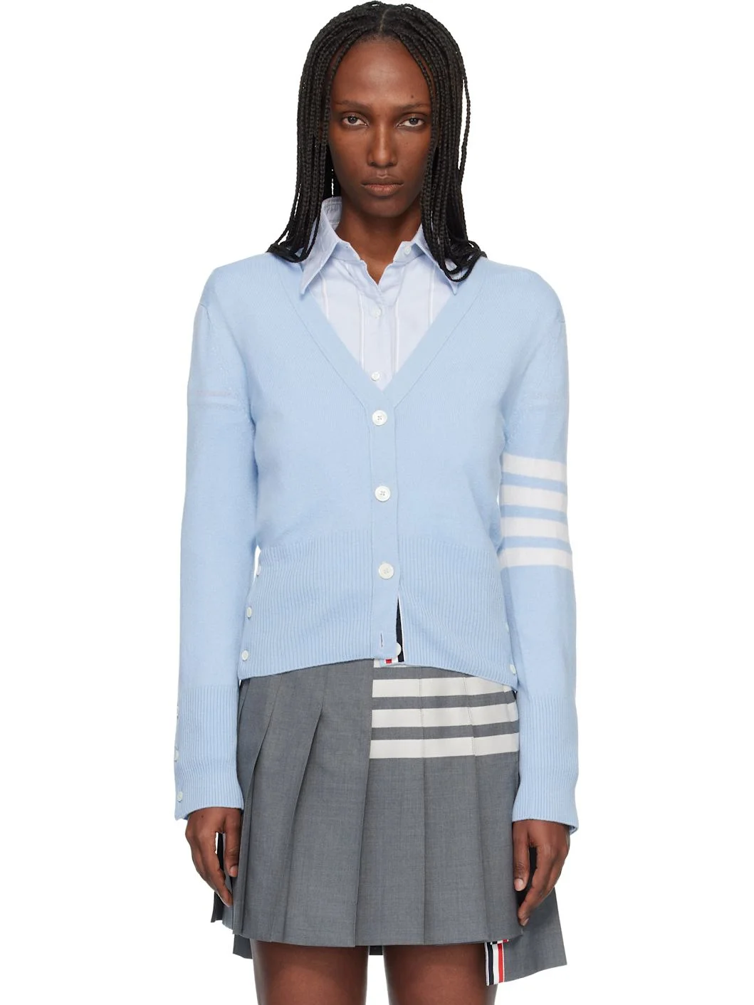 Knit cashmere cardigan. · Rib-knit Y-neck, hem, and cuffs · Button closure · Button vent at side seams and cuffs · Stripes at sleeve · Tricolor grosgrain flag at back collar Supplier color: Light blue 100% cashmere. Made in United Kingdom 261381F095005