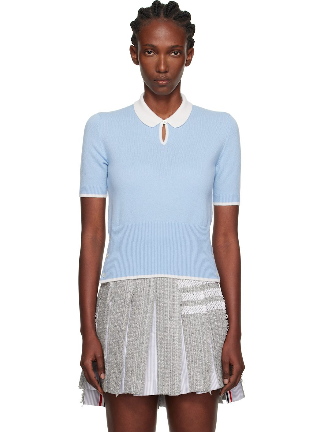 Knit cashmere polo. · Rib-knit spread collar, cuffs, and hem · Button keyhole at collar · Buttoned vent at side seams · Concealed tricolor trim at vents · Tricolor flag at back collar Supplier color: Light Blue 100% cashmere. Made in Italy 252381F108004