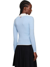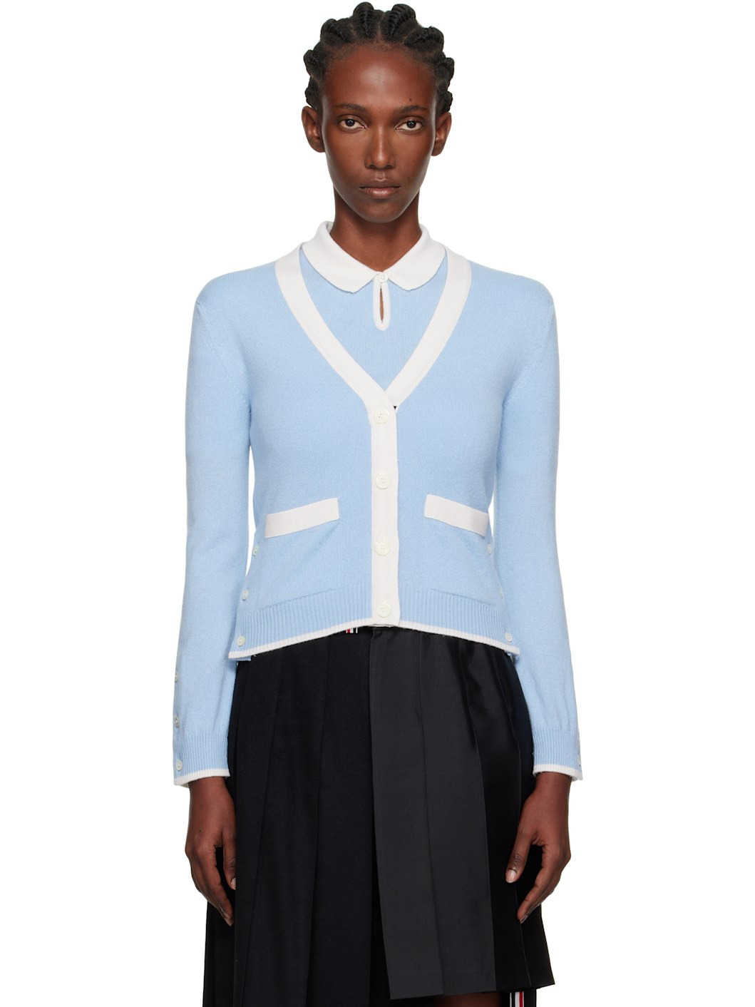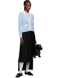 Knit cashmere cardigan. · Concealed tricolor grosgrain trim throughout · Rib-knit Y-neck, hem, and cuffs · Button closure · Patch pockets · Button vent at side seams and cuffs · Tricolor grosgrain flag at back collar Supplier color: Light Blue 100% cashmere. Made in United Kingdom 252381F095006