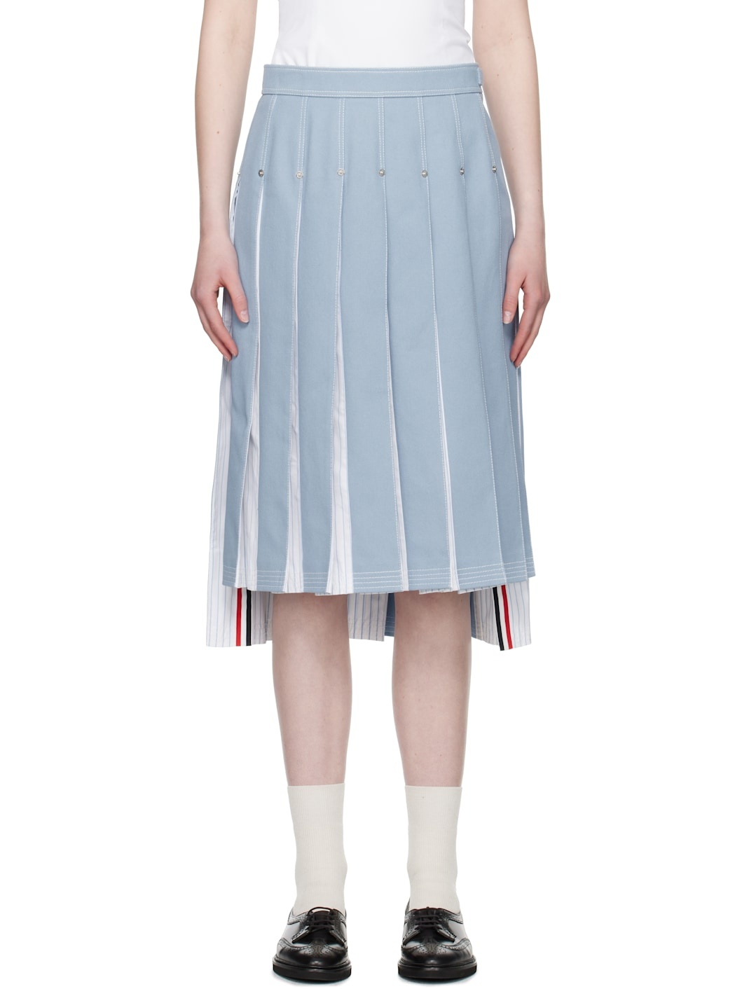 Non-stretch denim and cotton poplin midi skirt. Pleats, stripes, logo-engraved rivets throughout. · Paneled construction · Adjustable button tab at waistband · Tricolor grosgrain flag at back waistband · Full poplin lining · Contrast stitching in white Supplier color: Light blue Body: 100% cotton. Lining: 100% cotton. Made in Italy 252381F092000