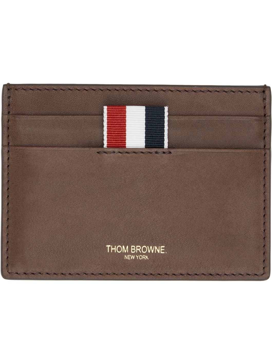 Buffed calfskin card holder in brown. · Logo stamp at face · Tricolor grosgrain flag · Two card slots · Central note slot · Striped grosgrain lining · H3" x W4" Supplier color: Dark brown Calfskin. Made in Italy 252381M163008