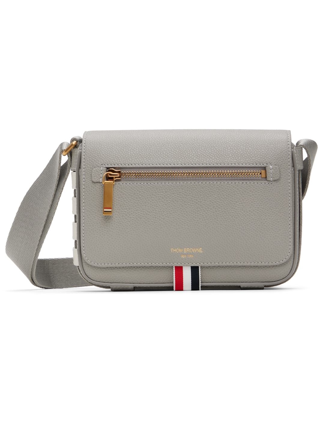 Pebble-grained leather messenger bag in gray. · Adjustable crossbody strap · Zip pocket and logo stamp at face · Tricolor grosgrain flag at face · Stripe appliques at side · Magnetic flap · Patch pocket at interior · Grosgrain lining · H5.5" x W8" x D2.5" Supplier color: Grey Leather. Made in Italy 252381M170005