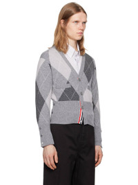 Knit cashmere cardigan. Argyle pattern throughout. · Rib-knit Y-neck, hem, and cuffs · Button closure · Welt pockets · Button vent at side seams and cuffs · Tricolor grosgrain flag at back collar Supplier color: Lt grey 100% cashmere. Made in United Kingdom 252381M200016