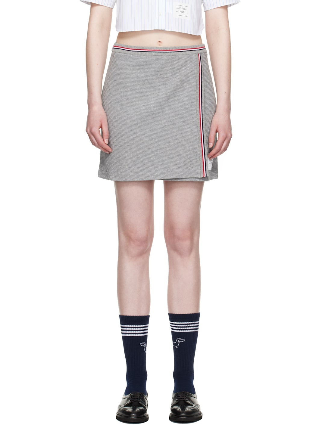 Lightweight waffle-knit cotton miniskirt. · Wrap construction · Tricolor stripes at rib-knit waistband and front · Logo patch at front hem · Tricolor grosgrain flag at back waistband · Unlined Supplier color: Lt grey 100% cotton. Made in Italy 252381F090000