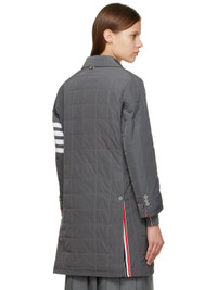 Down-filled quilted polyester twill coat. Concealed tricolor grosgrain trim throughout. · Notched lapel · Concealed button closure · Flap pockets · 4-bar stripe at sleeve · Four-button surgeons cuffs · Tricolor grosgrain flag at back collar · Twin vents at back hem · Welt pockets at interior · Full satin lining Supplier color: Medium grey Fill: 85% goose down, 15% polyester. Body: 100% polyester. Lining: 100% polyester.