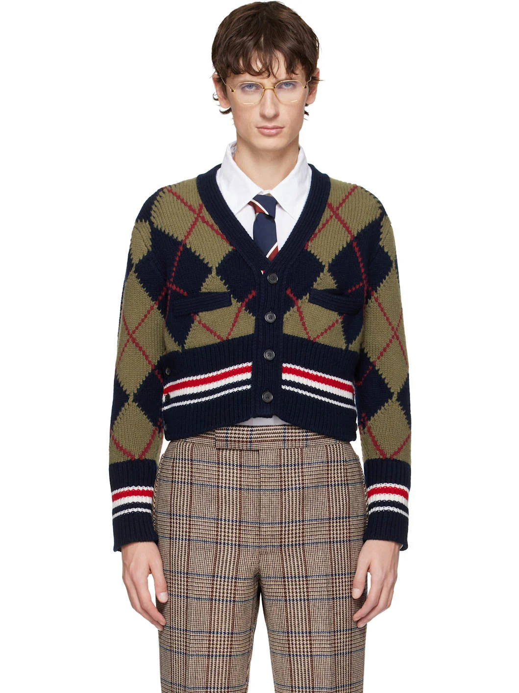 Knit virgin wool-blend cardigan. · Intarsia argyle pattern throughout · Rib-knit Y-neck, hem, and cuffs · Button closure · Stripes at hem and cuffs · Button vent at side seams and cuffs · Tricolor grosgrain flag at back collar Supplier color: Navy 93% virgin wool, 3% polyamide. Made in Italy 252381M200027