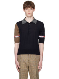 Knit virgin wool polo. · Rib-knit spread collar, hem, and cuffs · Five-button placket · Button vent at side seams · Stripes at sleeves · Tricolor grosgrain flag at back collar Supplier color: Navy/Grey/Brown 100% virgin wool. Made in Italy 252381M212011