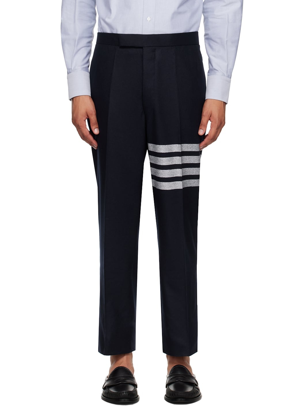 Wool- and cashmere-blend flannel trousers. · Low-rise · Four-pocket styling · Button-fly · Darts at waistband · Signature stripes at leg · Creased legs · Rolled cuffs · Cropped hem · Adjustable button tab at back waistband · Tricolor grosgrain flag at back waistband · Satin lining · Gold-tone hardware Supplier color: Navy Body: 95% wool, 5% cashmere. Lining: 100% cupro. Made in Japan 242381M191017