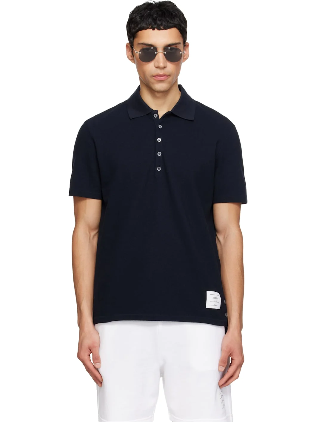 Cotton pique polo. · Rib-knit spread collar · Five-button placket · Logo patch at front hem · Button vent at side seams · Tricolor grosgrain flag at back collar · Stripes at back Supplier color: Navy Body: 100% cotton. Trim: 97% cotton, 3% elastane. Made in Italy 261381M212008