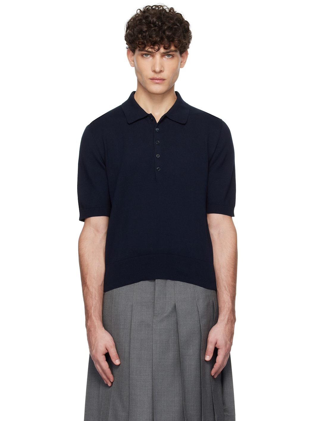 Knit cotton polo. · Rib-knit spread collar, hem, and cuffs · Five-button placket · Intarsia stripes at side · Button vent at side seams · Tricolor grosgrain flag at back collar Supplier color: Navy 100% cotton. Made in Italy 251381M212017
