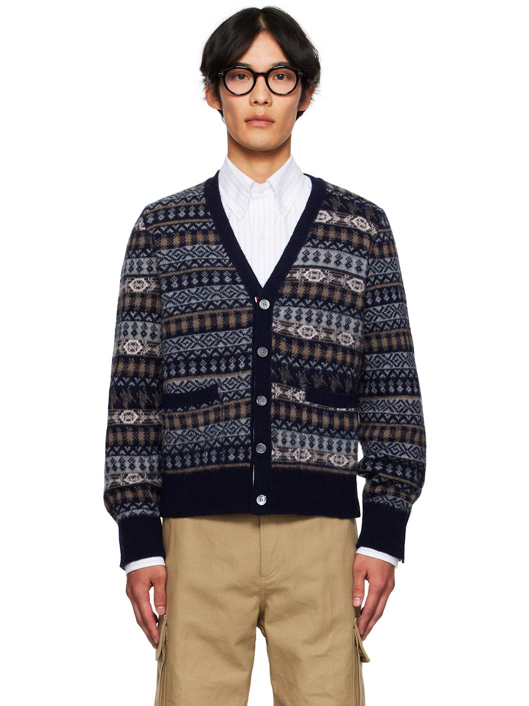 Brushed knit wool cardigan. · Jacquard graphic pattern throughout · Tricolor trim at placket and vents · V-neck · Button closure · Patch pockets at waist · Rib-knit hem and cuffs · Button vent at side seams and cuffs · Tricolor grosgrain flag at back collar Supplier color: Navy 100% wool. Made in Italy 252381M200014