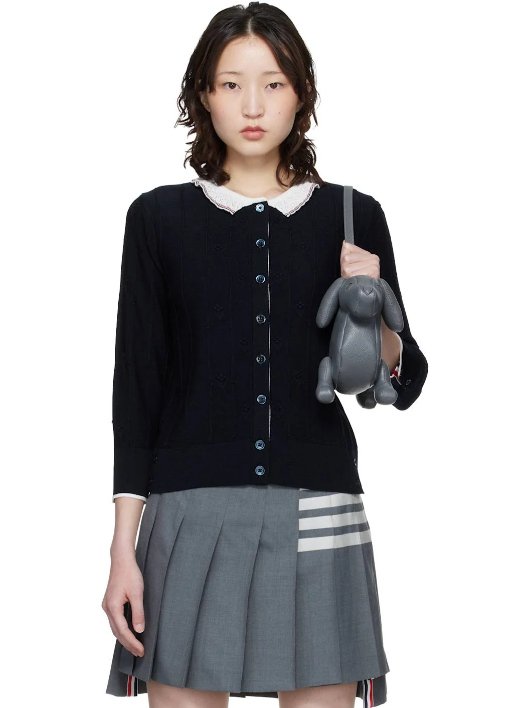 Navy Merino Wool Bobble Stitch Lace Trim Cardigan