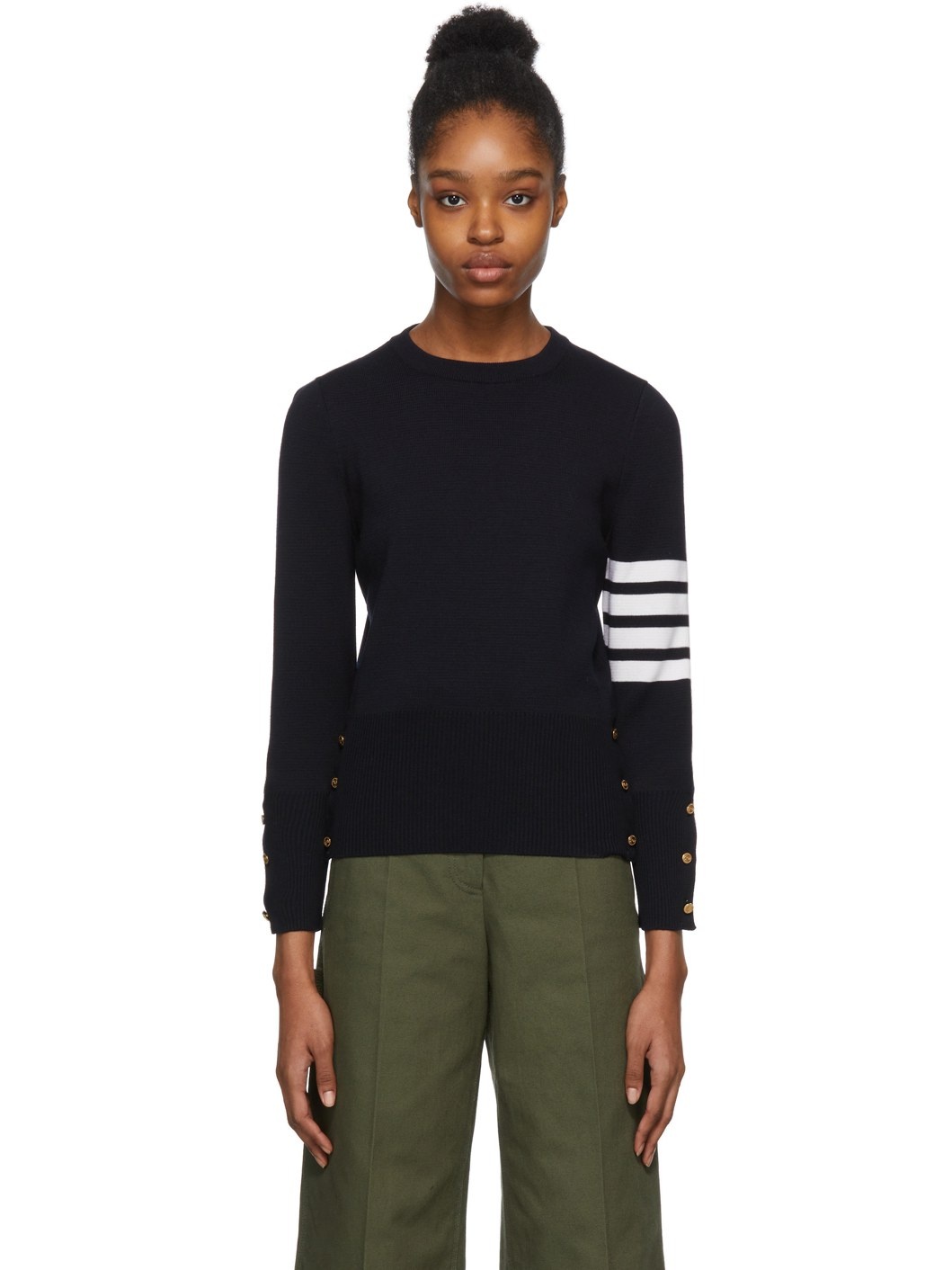 Long sleeve knit sweater in navy. · Buttoned vent featuring concealed signature tricolor trim at seams · Rib knit crewneck collar, cuffs, and hem · Signature stripes jacquard knit in white at sleeve · Signature tricolor grosgrain flag at back collar Supplier color: Navy 100% merino wool.