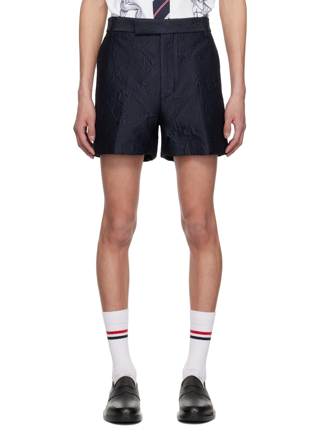 Cotton- and silk-blend matelasse shorts. Jacquard graphic pattern throughout. · Belt loops · Four-pocket styling · Zip fly · Creased legs · Tricolor grosgrain flag at back waistband · Full plain-woven cupro lining Supplier color: Navy Body: 72% cotton, 17% silk, 11% polyester. Lining: 100% cupro. Made in Italy 251381M193025