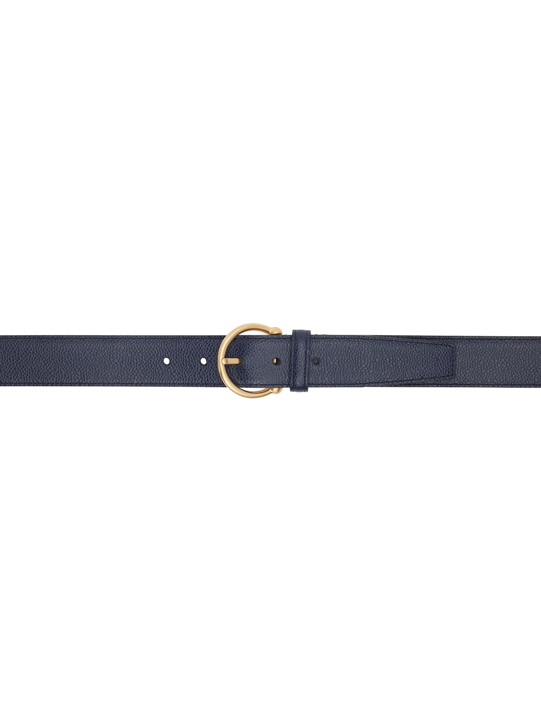 Pebble-grained calfskin belt in navy. · Pin-buckle fastening · Gold-tone hardware · W1.5" Supplier color: Navy Calfskin. Made in Italy 252381M131001