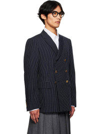 Wool canvas blazer. · Pinstripes throughout · Notched lapel · Double-breasted button closure · Welt pocket at chest · Flap pockets at front · Padded shoulders · Buttoned surgeon's cuffs · Tricolor grosgrain flag at back collar · Vents at back hem · Welt pockets and button tab at interior · Full cupro satin lining Supplier color: Navy Body: 100% wool. Lining: 100% cupro. Made in Italy 252381M195005