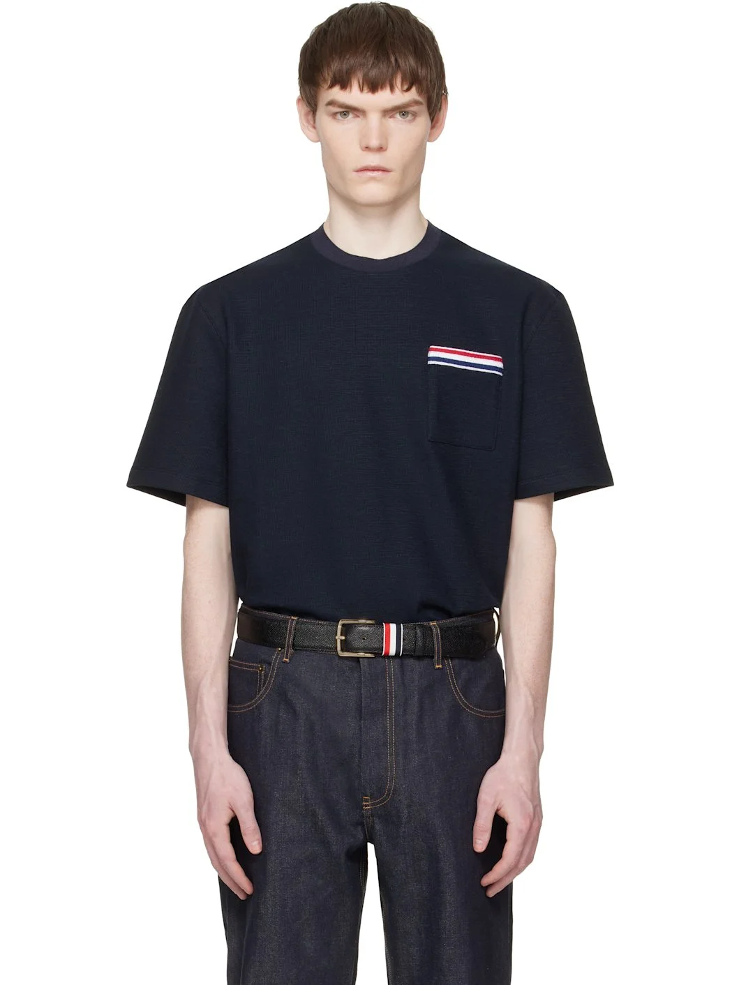 Waffle-knit stretch cotton- and linen-blend T-shirt. · Rib-knit crewneck · Patch pocket with stripes at chest · Logo patch at front hem · Button vent at side seams · Tricolor grosgrain flag at back collar Supplier color: Navy Body: 55% cotton, 36% linen, 7% polyamide, 2% elastane. Trim: 97% cotton, 3% elastane. Made in Italy 261381M213018