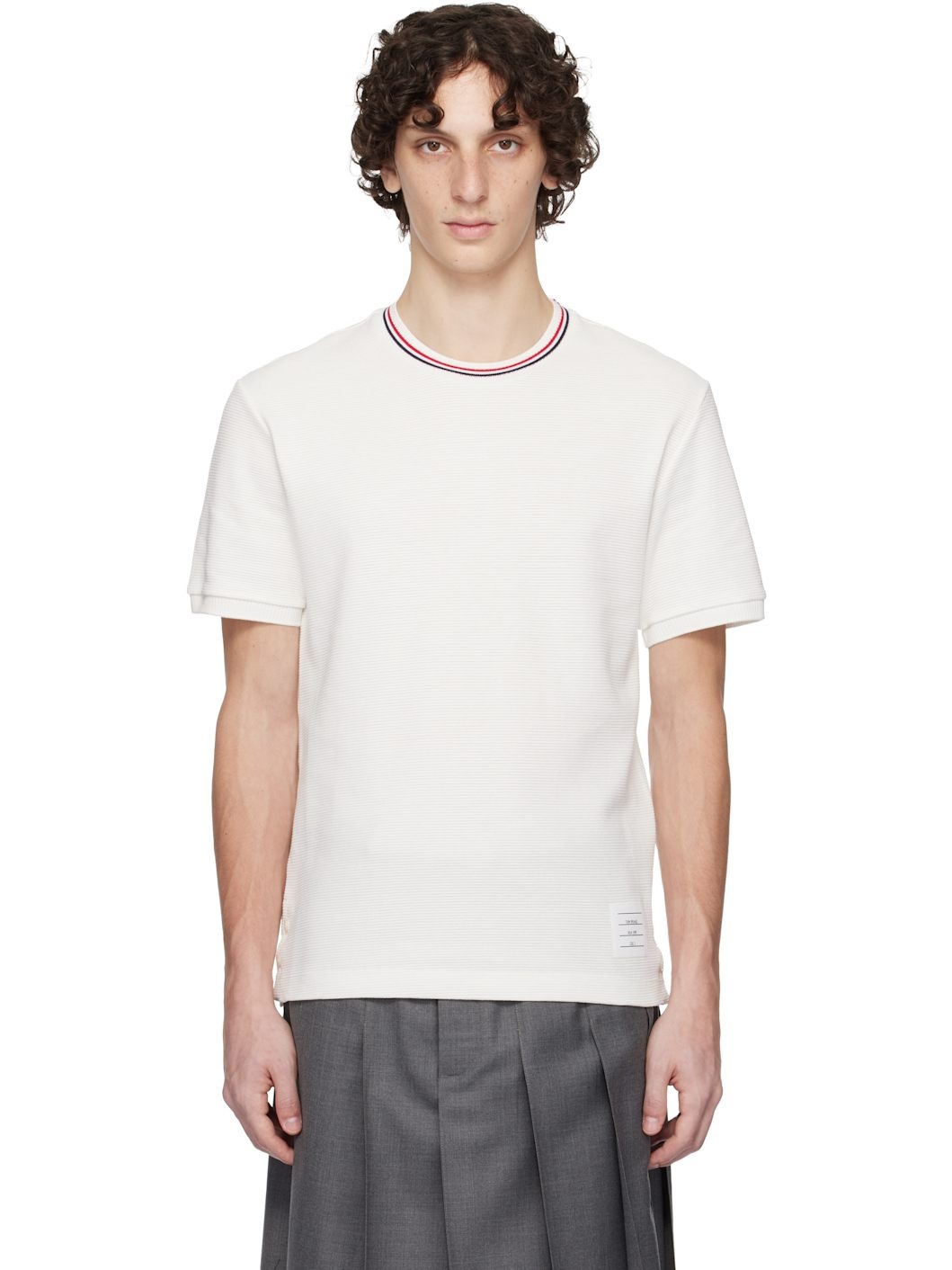 Waffle-knit cotton T-shirt. · Rib-knit crewneck and cuffs · Tricolor stripes at collar · Logo patch at front hem · Button vent with tricolor grosgrain trim at side seams · Tricolor grosgrain flag at back collar Supplier color: Natural white Body: 100% cotton. Trim: 98% cotton, 2% elastane. Made in Italy 252381M213002