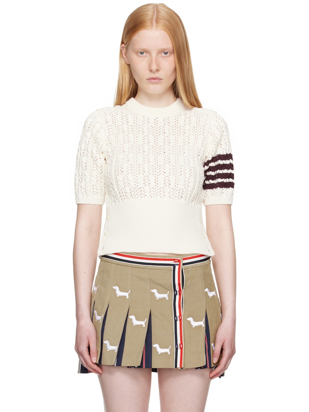 Pointelle-knit cotton sweater. Cable-knit detailing throughout. · Rib-knit crewneck, hem, and cuffs · Button vent at side seams with tricolor grosgrain trim · Intarsia stripes at sleeve · Tricolor grosgrain flag at back collar Supplier color: White 100% cotton. Made in Italy 252381F096001