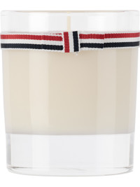 Scented wax candle. Mouth-blown glass vessel with tricolor grosgrain trim. - Top notes: papyrus, rhubarb - Heart notes: leather, patchouli - Base notes: vetiver, cedarwood - Cotton wick - Burn time: 20 hrs - H3.75 x D3 / 175 g