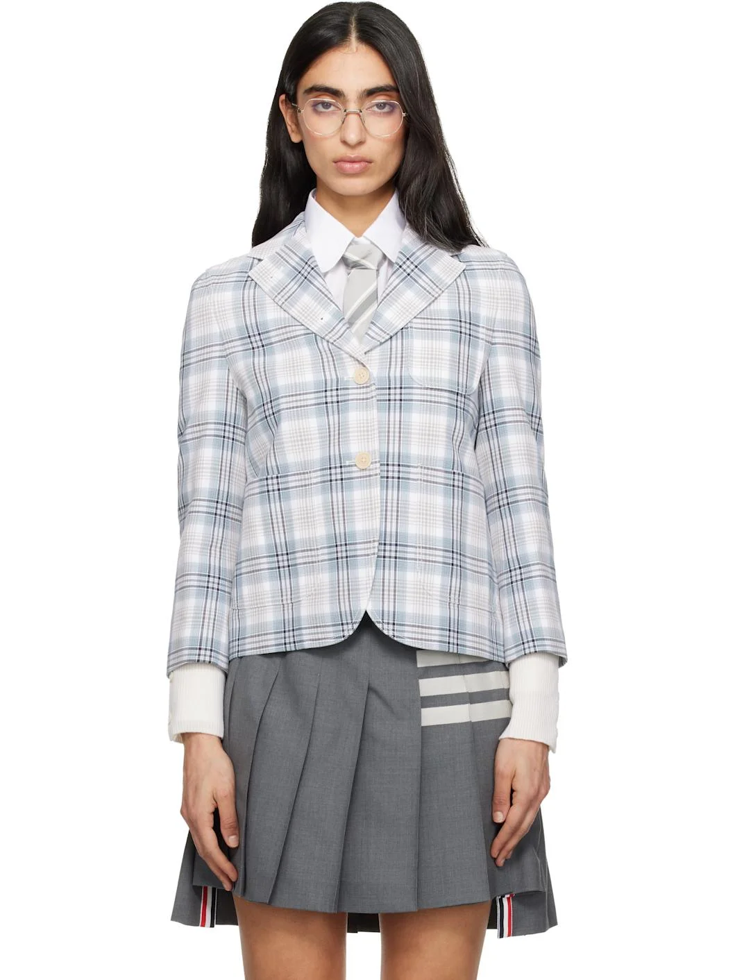 White & Blue Cropped Sack Plaid Cotton Blazer