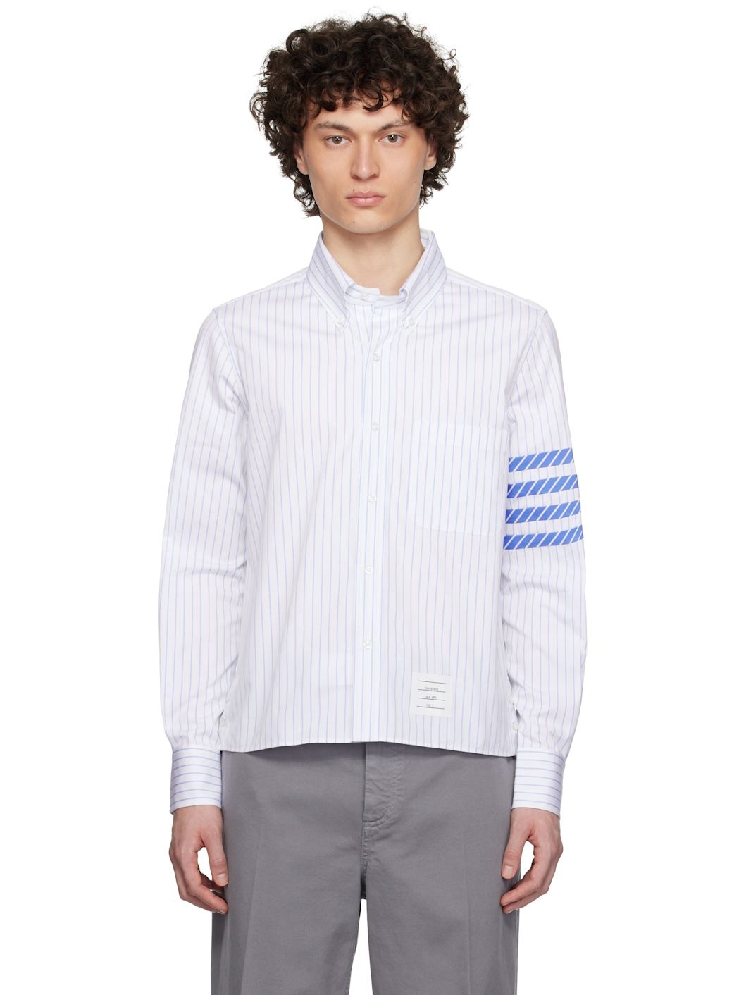 Cotton poplin shirt. Stripes throughout. · Spread collar · Button closure · Patch pocket at chest · Logo patch at front hem · Buttoned vent with concealed tricolor trim at side seams · Striped appliques at sleeve · Buttoned barrel cuffs · Tricolor grosgrain flag at back collar · Locker loop and pleats at back yoke Supplier color: Light blue 100% cotton. Made in Italy 252381M192013